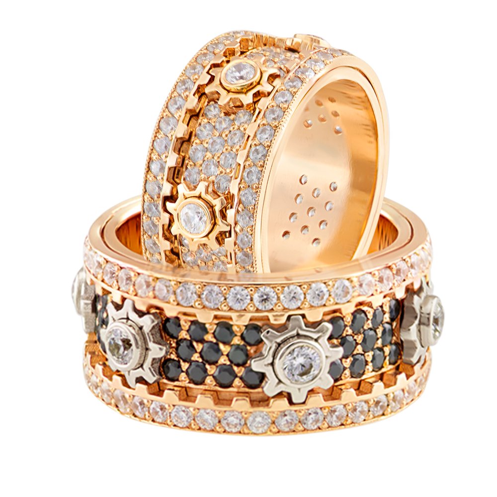 Оригінальні обручки в червоному кольорі золота з рухомим механізмом. На чоловічій каблучці встановлено безбарвні та чорні камені діаметром 1.5 мм і 2.5 мм. На жіночій каблучці безбарвні камені діаметром 1.5 мм і 2.5 мм. Ширина даних моделей каблучок 10мм. Вага знаходиться у співвідношенні з розміром. Дизайн можна змінювати за бажанням клієнта.