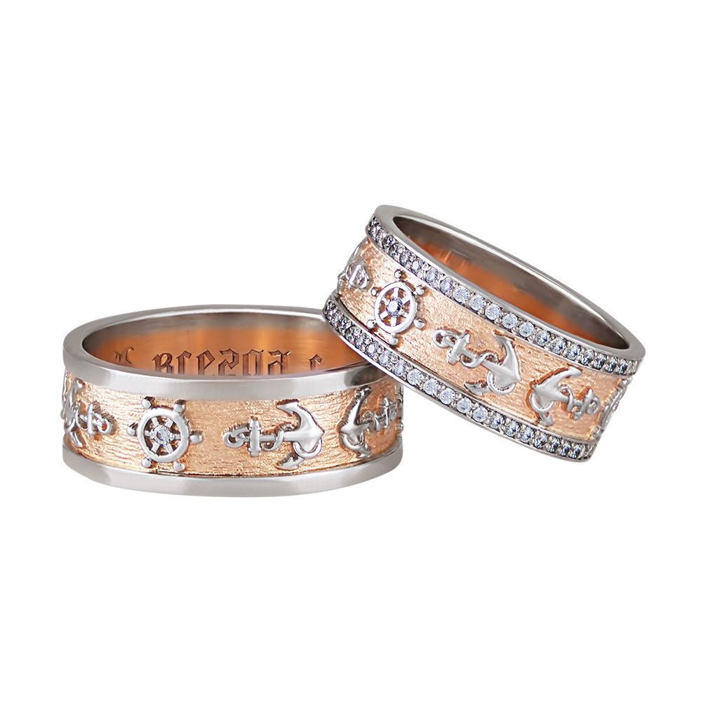 Обручки в червоному і білому кольорі золота, основа в червоному, борти, якорі та штурвали в білому золоті покриті родієм.  На жіночій каблучці по бортах і штурвалах розташовані діаманти. У чоловічій каблучці борти гладкі, але по штурвалах також розташовані камені. Камені можна встановити будь-які, за бажанням клієнта. Діаметр каменів 1мм (52шт); 1.2мм (4шт).