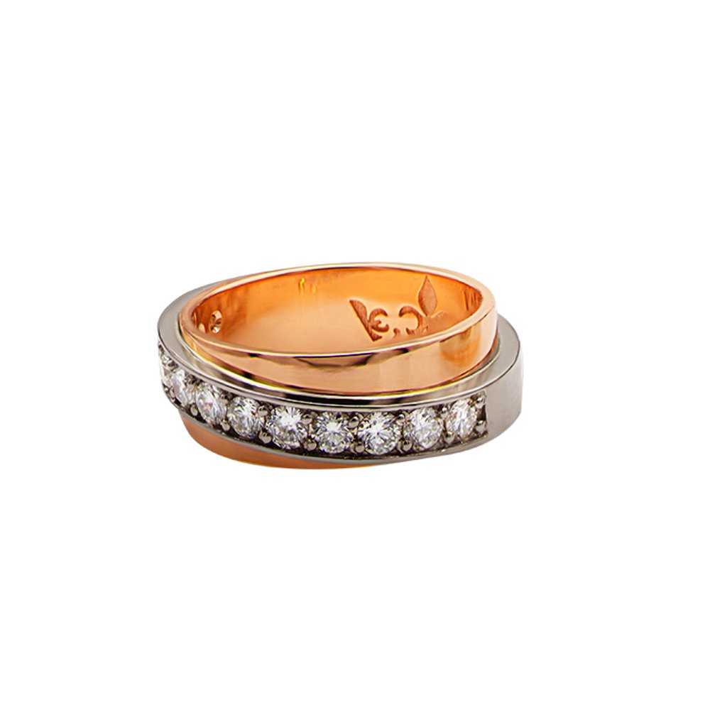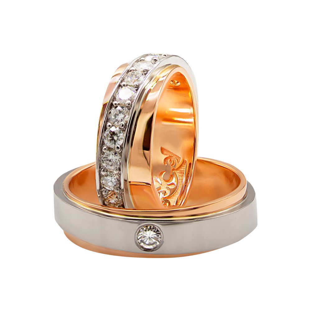Обручки в червоному і білому золоті 585*, з діамантами діаметром 2.5 мм, ширина обручок 6-7 мм.