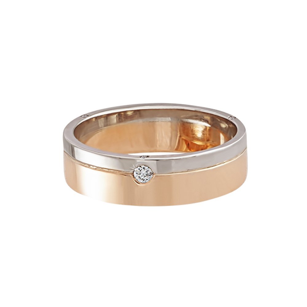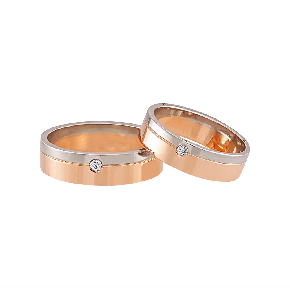 Обручки в червоному і білому золоті. Основна частина обручки в червоному, і борт у білому золоті, покритий родієм. Вага змінюється відповідно до розміру. Ширина каблучок від 5.5 мм, товщина 1.2 мм. На каблучках по центру встановлене каміння діаметром 2.00мм, також на жіночій каблучці по торцю встановлено каміння 1.25мм (3шт). Можна встановити будь-які камені за бажанням клієнта.