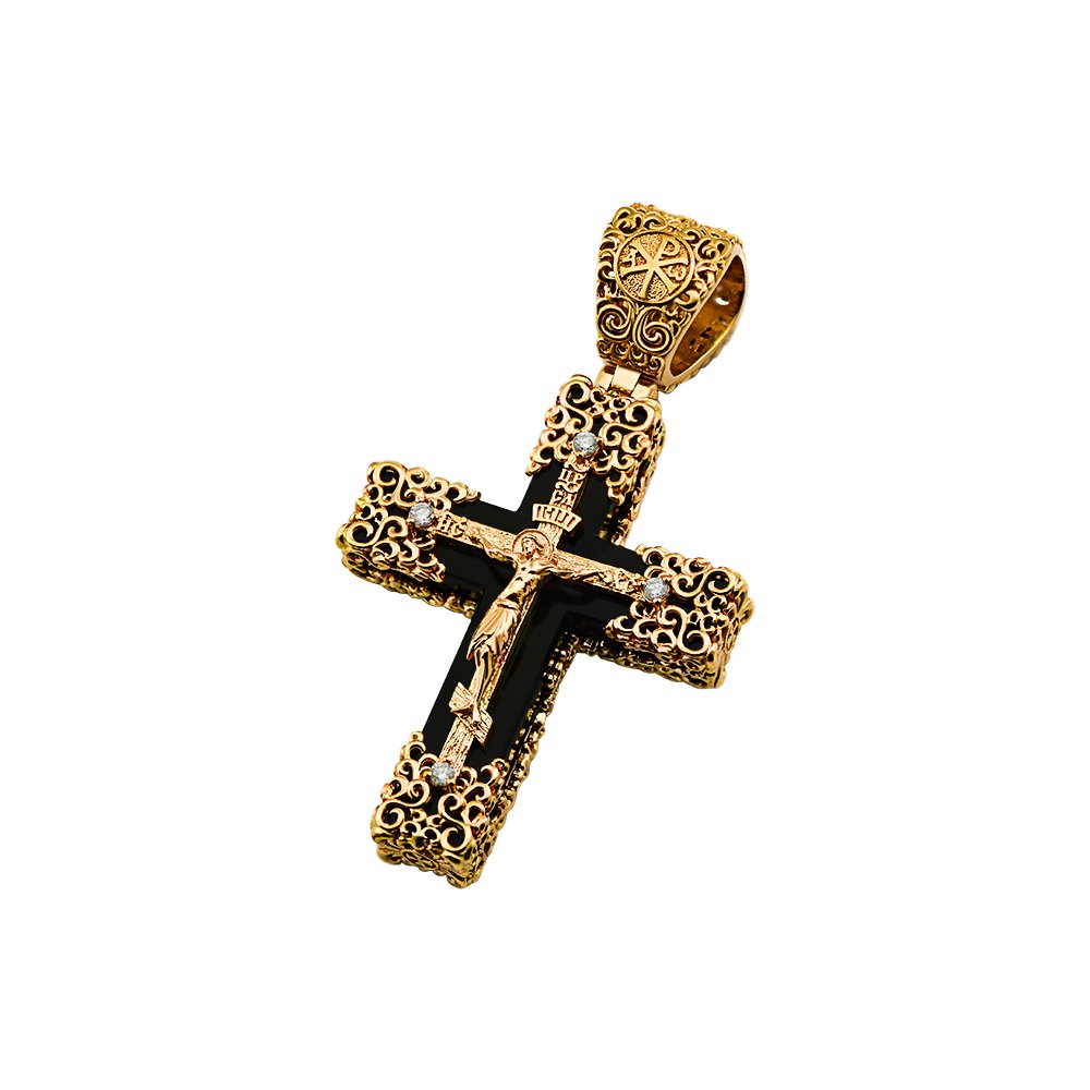 Унікальний хрестик з червоного золота, на основі агату. Дизайн цього хрестика був зроблений за побажаннями клієнта, і він може бути змінений. На хрестику розміщені діаманти діаметром 2 мм. Висота хрестика у вусі 55 мм.